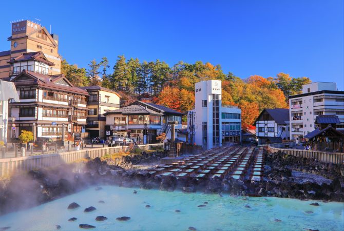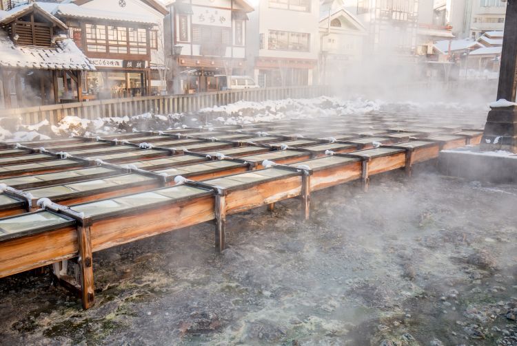 Heißer Dampf steigt auf, wenn sich das Wasser in das smaragdgrüne Becken ergießt. Kusatsu Onsen verfügt über die größte Menge natürlich vorkommenden heißen Quellwassers in Japan. Das Wasser soll dank hoher Temperatur (rund 55 Grad Celsius) und eines hohen Säuregrades gegen viele Beschwerden helfen und besonders gut für die Haut sein. Mehrere Tokugawa-Shoguns ließen das Wasser in Fässern in ihre Burg in Edo (das heutige Tokyo) transportieren.