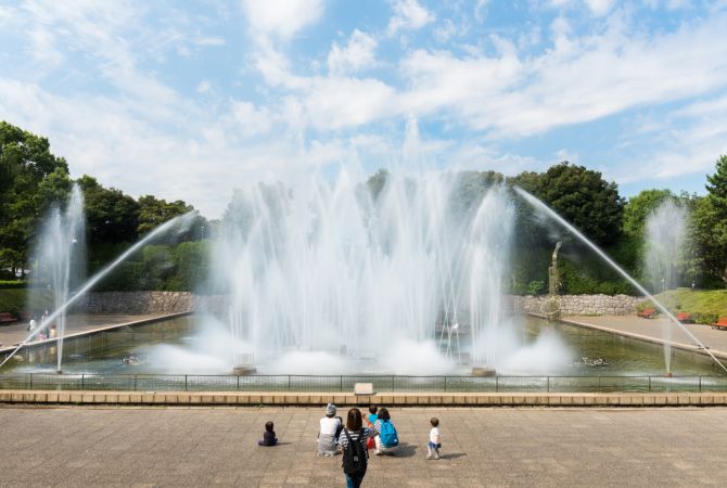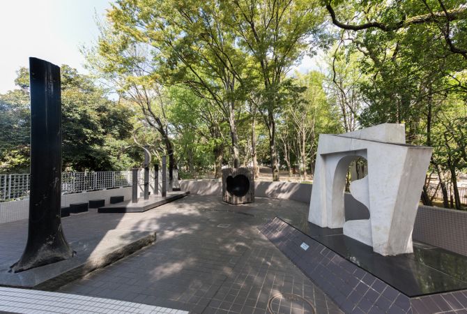 Der Kita-Urawa-Park enthält Skulpturen und einen angenehm plätschernden Springbrunnen