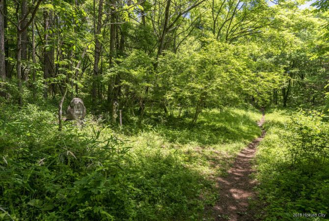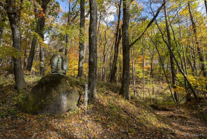 Der Wanderweg passiert dann eine Reihe religiöser Steinmetzarbeiten, darunter Ojizo-Sama, ein Gott, der die Reisenden schützen soll.