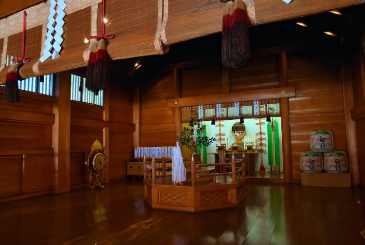 Hinter dem Haiden sind drei Schreine aufgereiht. In der Mitte ist Amaterasu Omikami, die höchste Gottheit des japanischen Shinto, untergebracht. Die Gebäude sind im architektonischen Stil der Shinmei-Struktur errichtet - demselben Stil, der auch im Ise-jingu-Schrein zu finden ist. Die feierliche Atmosphäre in den Hallen trägt dazu bei, die Herzen der Gläubigen zu reinigen und ihnen ein Gefühl der Tugendhaftigkeit im Einklang mit der Natur zu vermitteln.