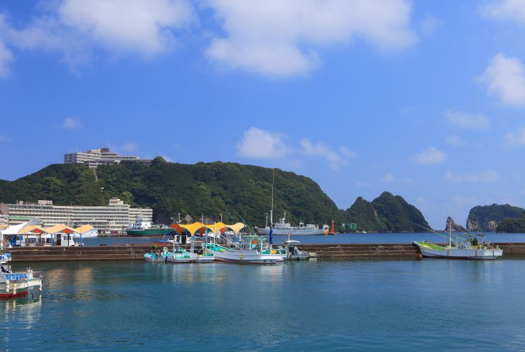 Die abgeschiedene Bucht ist von rund 130 kleinen Felsinseln durchzogen, die für ruhige Gewässer sorgen. In der wärmeren Jahreshälfte ziehen Gruppen von Walen und Delfinen durch dieses Gebiet. In dem ruhigen Wasser liegen mehr als 100 kleine Felseninseln, die in der warmen Jahreszeit häufig von Wal- und Delfinschwärmen besucht werden. Genießen Sie köstliche regionale Meeresfrüchte und atmen Sie die klare Luft der Katsuura-Bucht ein.