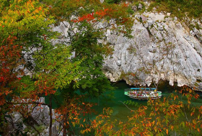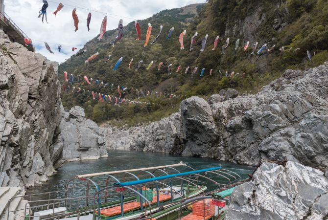 Genießen Sie die Pracht der Oboke-Schlucht in Tokushima während einer 30-minütigen Fahrt auf einem Ausflugsboot. Gehen Sie an Bord, ziehen Sie Ihre Schuhe aus und entspannen Sie sich auf Tatami-Matten, während das Boot stromabwärts gleitet. Sie haben reichlich Zeit, um das smaragdgrüne Wasser und die hoch aufragenden Felswände ausgiebig zu bewundern.