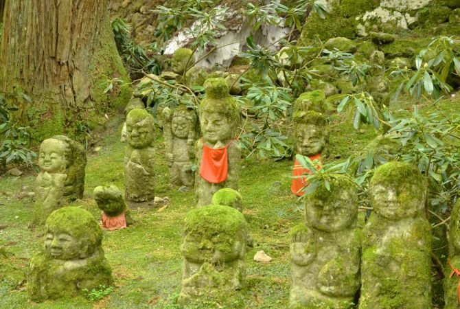Nach weiteren Treppenstufen erreichen Sie den Sanbutsji-Tempel. Dort wird kostenloser Tee angeboten. Hinter dem Tempel beginnt der Wanderweg. Dort müssen Sie sich anmelden und eine Gebühr entrichten. Wenn das Profil Ihrer Schuhe als unzureichend erachtet wird, kaufen Sie Waraji-Sandalen, um Ihre Reise fortzusetzen. Handschuhe aus Baumwolle zum Schutz der Hände sind optional.