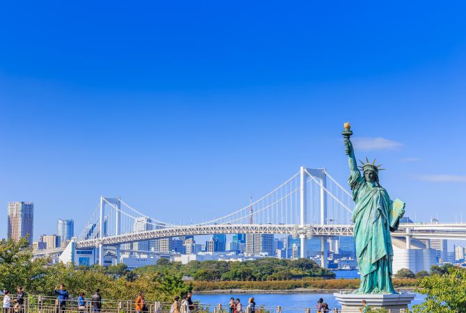 Visible from Rainbow Bridge, Odaiba Kaihin Koen is one of Tokyo's only open white-sand beach areas. While you are not permitted to swim in the water, other marine activities are available such as volleyball, paddle boarding, surfing, and windsurfing. Walk along the beach as you look at the Tokyo skyline and consider renting some gear. At one end of the park is an interesting, if somewhat perplexing, feature: a replica of the Statue of Liberty.