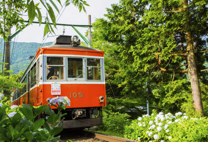 Once in the area, the Hakone Tozan line is one of Japan's most scenic rides, and takes you along steep slopes and lush green river valleys as you travel from stop to stop.