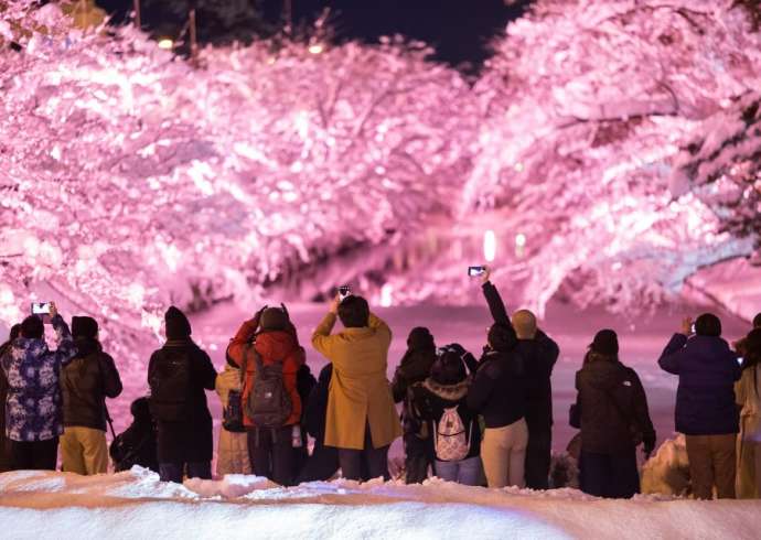 The winter cherry blossom light up event is held annually from December to February. During the event, the snow on the branches of the cherry trees around Hirosaki Park is illuminated by pink lights, creating a beautiful and moving scene as if the cherry trees were in full bloom in winter. Many people, both local residents and visitors, come to enjoy these gleaming pink cherry trees while walking along the edge of the frozen castle moat.