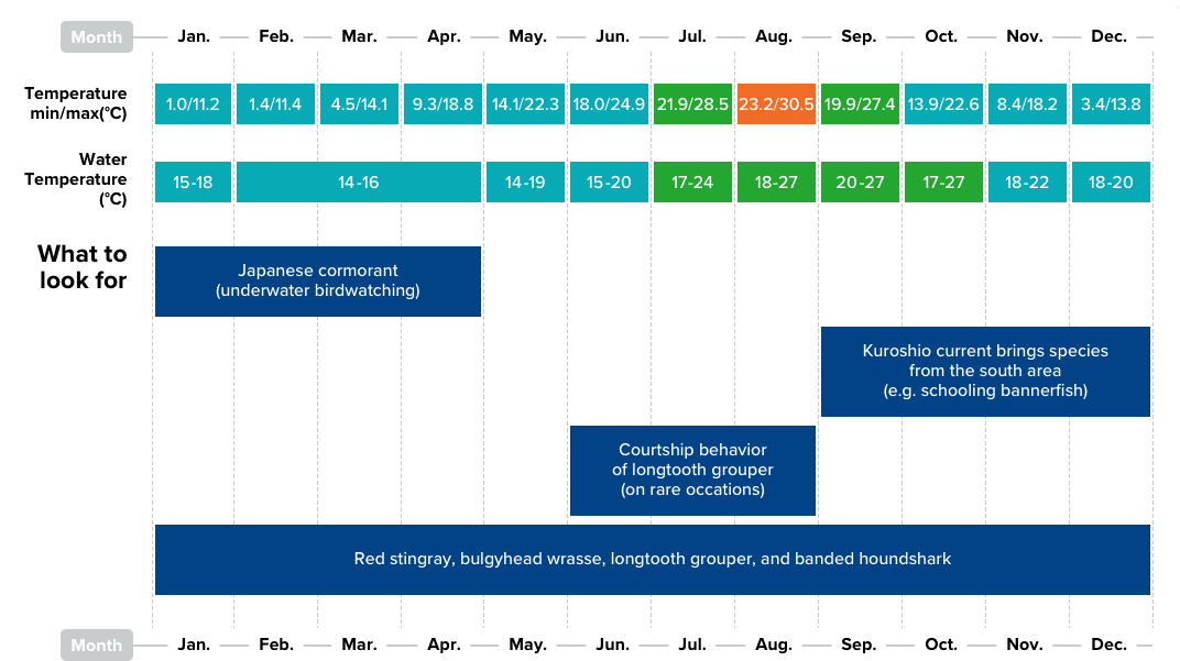 Located at the very tip of the Boso Peninsula, Kuroshio Current hits this area directly, leading to a relatively high water temperature year-round and an abundance of marine life. Nishikawana offers a diverse assortment of dive sites, from cavern to sandy bottom. Ohne, one of these boat dive sites, offers the chance to observe many of the giant beard grunts Nishikawana is famous for. Schools of pelagic fish also start to appear around May, and if you’re lucky, you may be able to see a few hundred Japanese eagle rays!