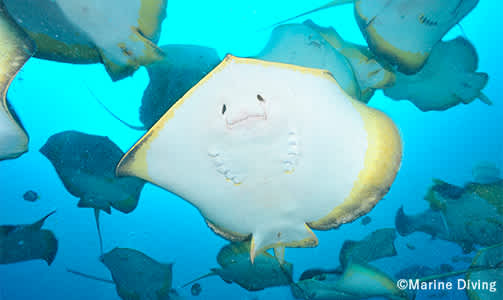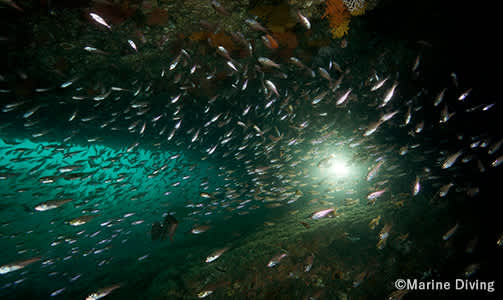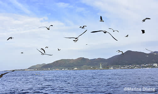 Possibly the most internationally well-known dive site in Chiba,divers from around the world come to meet the hundreds of banded houndsharks that live here, as well as the large populations of red stingray, bulgyhead wrasse, and longtooth grouper. The dive site at the heart of this popularity is Okimae-ne, a boat dive site located where the sharks gather. From January to early April, you can even enjoy birdwatching underwater, as Japanese cormorant dive into the ocean in search of prey.