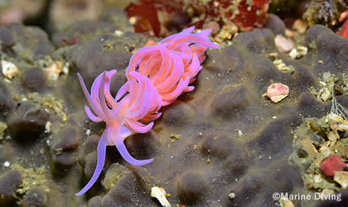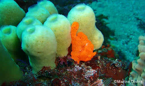 Kenbutsu has both shore dive site and boat dive sites. Oki-gyosho features an artificial fish reef in place for fishing, and the sea sponges that grow from it create the perfect home for small sea creatures such as frogfish. Triangle, a boat dive site, hosts a thriving population of several different kinds of corals, providing a great environment for small fish and juveniles.