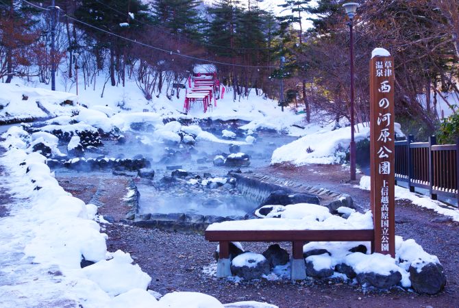 Sainokawara Park lies in a valley not far from Kusatsu Onsen Resort , and offers a relaxing hike around an area rich with hot spring water. You can hear the sounds of the water trickling around you and even see it collecting in little pools. It's also home to one of Japan's largest outdoor hot springs.