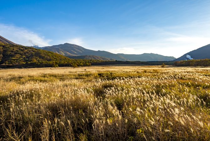 Follow the trail from Chojabaru which leads up to the tops of Mt. Ito, and three-domed Mt. Mimata, both of which offer incredible views of the scenery below. In warmer months, the wetlands are lush and green, but as temperatures fall, they turn beautiful shades of golden brown. The area also has excellent camping facilities if you'd like to explore for another day.