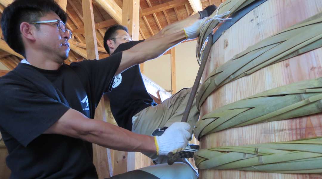A: Making ‘kioke’ wooden barrels takes a surprising amount of time. After preparing the materials, like the local bamboo and cedar planks, it takes roughly 10 days and 5 people to build. The braided bamboo hoop that goes around the barrel, called ‘Taga’, I actually make myself but in order to harvest the bamboo from the grove, cut it down to size, bring it home and make sure the taga hoop fits, it takes a lot more time and definitely more than just one person. As for the finished product, the salt involved in the brewery process means the wood doesn’t really rot, so they can last over a 100 years if used properly and carefully.