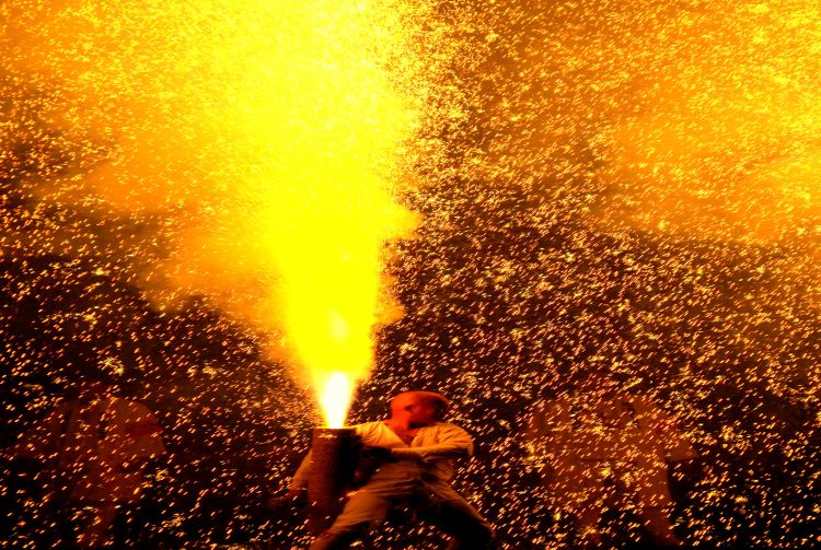 Al caer la noche, unos artistas ataviados con trajes tradicionales suben al escenario portando grandes tubos de bambú llenos de pólvora. De repente, fuentes de llamas se disparan a diez metros de altura, llenando el cielo nocturno de fuego y humo, y las chispas caen en cascada sobre los artistas que se encuentran debajo.