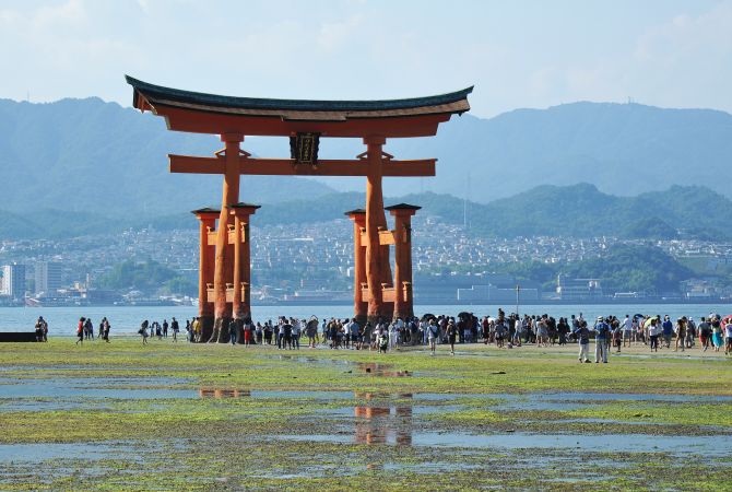 Con la marea alta, el santuario de Itsukushima y la puerta Otorii parecen flotar en el agua, mientras que con la marea baja los cimientos del santuario y los lodazales quedan al descubierto. En ese momento se puede caminar hasta la puerta y aprovechar la gran oportunidad de hacer fotos desde cerca.