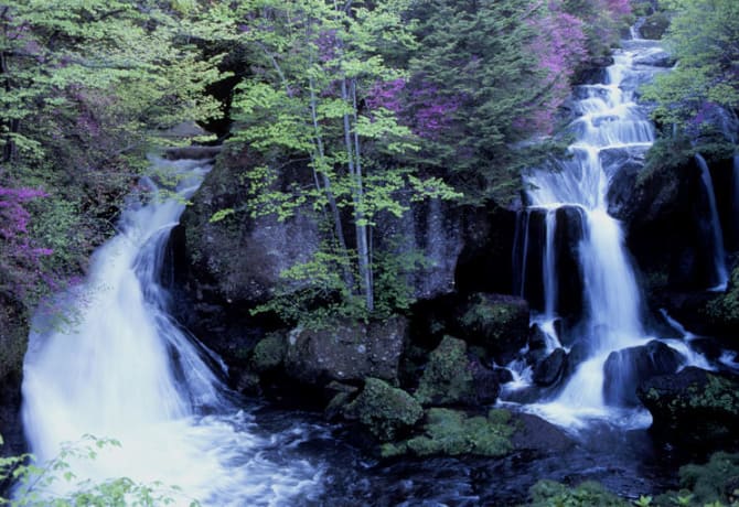 Les chutes Ryuzu-no-taki sont ainsi nommées car on dit qu'elles ressemblent à une tête de dragon. Les premières couleurs de l'automne apparaissent fin septembre. La cascade Yudaki, qui constitue la source de la rivière Yu de Nikko, est une chute d'eau spectaculaire de 25 mètres de large qui dévale le long d'une abrupte paroi rocheuse de 70 mètres de haut.