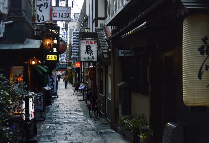 Dirigez-vous au sud vers Namba via Hozenji Yokocho, une route étroite pavée qui évoque l'atmosphère tranquille d'Osaka il y a bien longtemps. Passez devant le temple Hozenji et descendez la rue Sennichimae jusqu'à Shinsekai, un quartier de divertissement rétro.