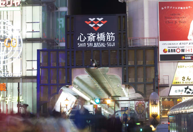 La rue commerçante Shinsaibashi-suji s'ouvre sur Minami. Quartier prospère depuis l'ère Edo (1603-1867), sa galerie marchande montre à quel point sa croissance a suivi de près celle d'Osaka.