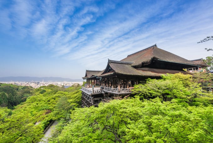 Perché sur le versant de la montagne, le temple Kiyomizudera possède un pavillon principal à l'architecture extraordinaire qui mérite une visite. Vous y admirerez non seulement le réseau compliqué de piliers qui soutiennent sa grande plate-forme, mais aussi sa structure résistante aux tremblements de terre, réalisée sans clous. Nous vous recommandons de commencer votre visite de bonne heure et de vous armer de courage pour gravir la colline qui y mène. Le yama-zakura de montagne avec des pétales blancs est la principale variété de cerisier présente ici.