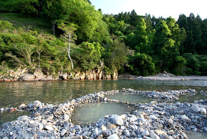 Le long de la route se trouvent les auberges pittoresques du village de Kumano Hongu Onsen. Alors que l'eau chaude sort du sol en bouillonnant, elle se mêle à l'eau fraîche de la rivière, créant ainsi une température idéale pour se baigner. Ici, les visiteurs peuvent creuser leur propre bain et faire bouillir des œufs et des légumes dans une eau de source chaude à 90°C. La ville abrite un certain nombre de ryokan (auberges japonaises) pour ceux qui souhaitent y passer la nuit.