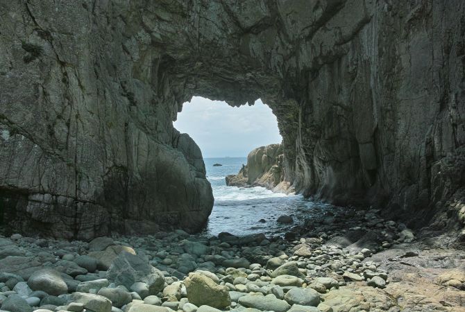 Un sentier de deux kilomètres au bord de la mer serpente à travers les paysages bruts du cap Ashizuri dans la préfecture de Kochi . Il surplombe les vagues puissantes qui déferlent plus bas. De nombreux lieux mystérieux associés à Kobo Daishi, le moine bouddhiste japonais le plus influent également connu sous le nom de Kukai, bordent les sentiers de cette région.