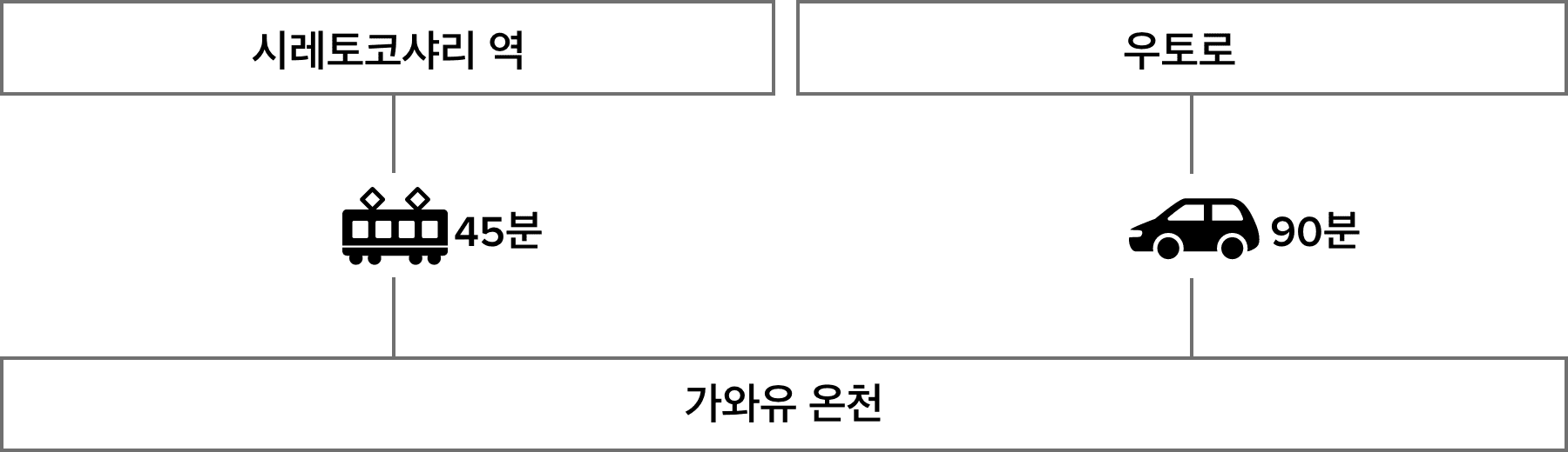 JR 센모선을 타면 시레토코샤리역에서 가와유 온천까지 가는 데 약 45분 소요됩니다. 자가 운전을 선택할 경우, 시레토코 반도 서쪽 끝에 있는 우토로에서 334번 국도를 타고 가다 보면 가와유 온천에 도착하기 전 391번 국도와 이어집니다. 소요 시간은 약 90분입니다.