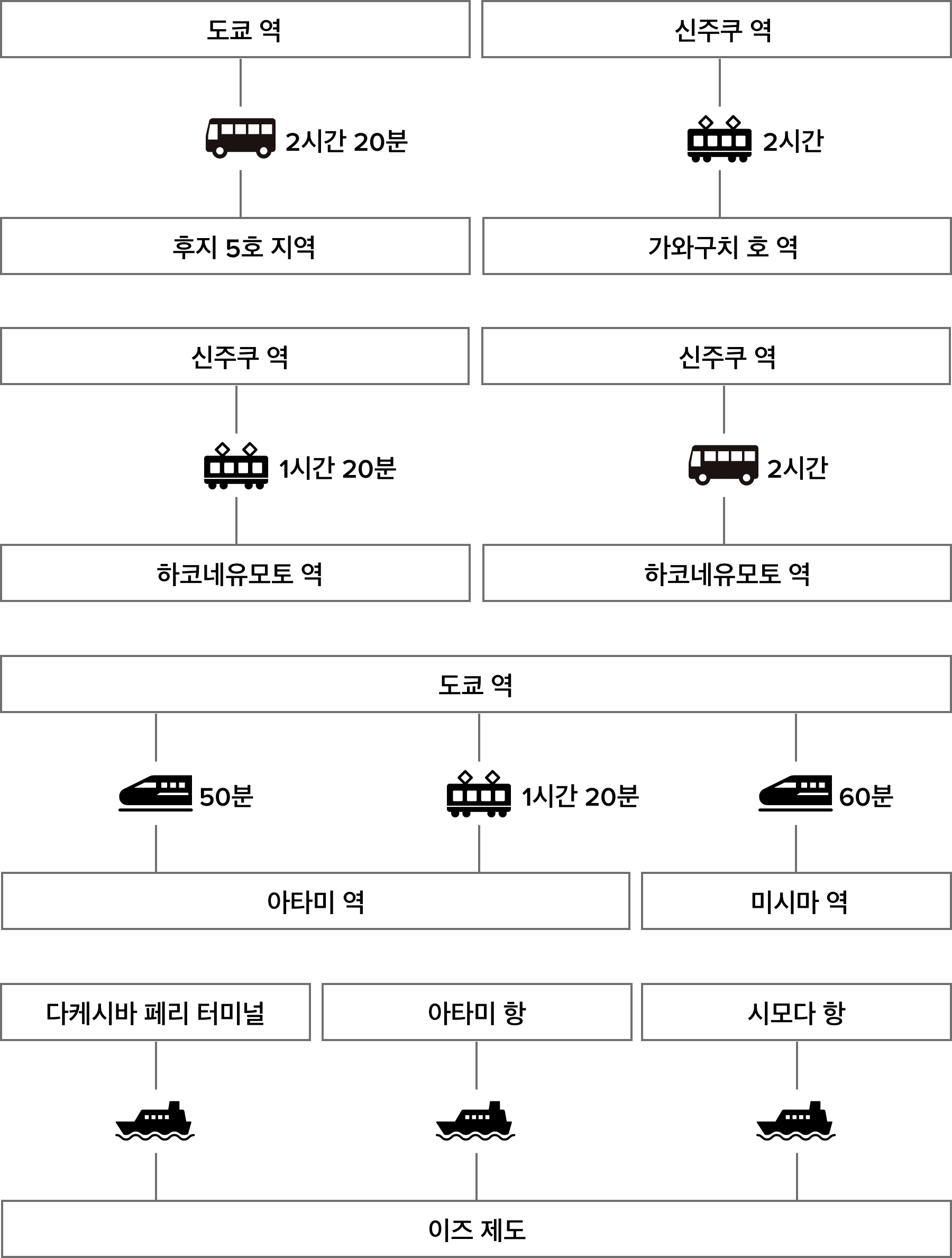 후지 5호 지역은 호수와 상징적인 후지산의 전경이 매우 멋진 곳입니다. 도쿄 각지에서 갈 수 있는 제일 쉬운 코스는 후지큐코 버스, 게이오 버스, JR 간토 버스 등의 회사가 운행하는 고속버스(2시간 20분)를 타고 제일 번화한 가와구치코 호수 지역으로 가는 것입니다. 신주쿠역에서 가와구치코역까지 가는 직행 특급열차 2개 노선이 매일 운행합니다(2시간). 온천으로 유명한 하코네 지역에서도 세계적인 수준의 박물관과 후지산의 멋진 전경을 즐길 수 있습니다. 신주쿠역과 하코네 유모토역을 오가는 오다큐 직행 전철 ‘로맨스 카(1시간 20분)’와 오다큐 하코네 고속버스(2시간) 등 도쿄에서 출발하는 여러 경로가 있습니다. 이즈 반도로 가려면 도카이도 신칸센을 타고 아타미(50분)나 미시마(50~60분)로 가거나, 오도리코 특급열차를 타고 아타미(1시간 20분)에 내리는 방법이 있습니다. 아니면 이즈하코네 철도 슨즈선을 따라 슈젠지 지역을 방문해보세요. 머무르며 이즈 반도를 둘러보기 좋은 곳입니다. 이즈 제도를 빠르게 여행하려면 도쿄의 다케시바 페리 터미널에서 도카이 기센 페리를 타거나, 아타미나 시모다 항구에서 고즈시마, 시키네지마, 니지마, 도시마를 방문하면 됩니다.