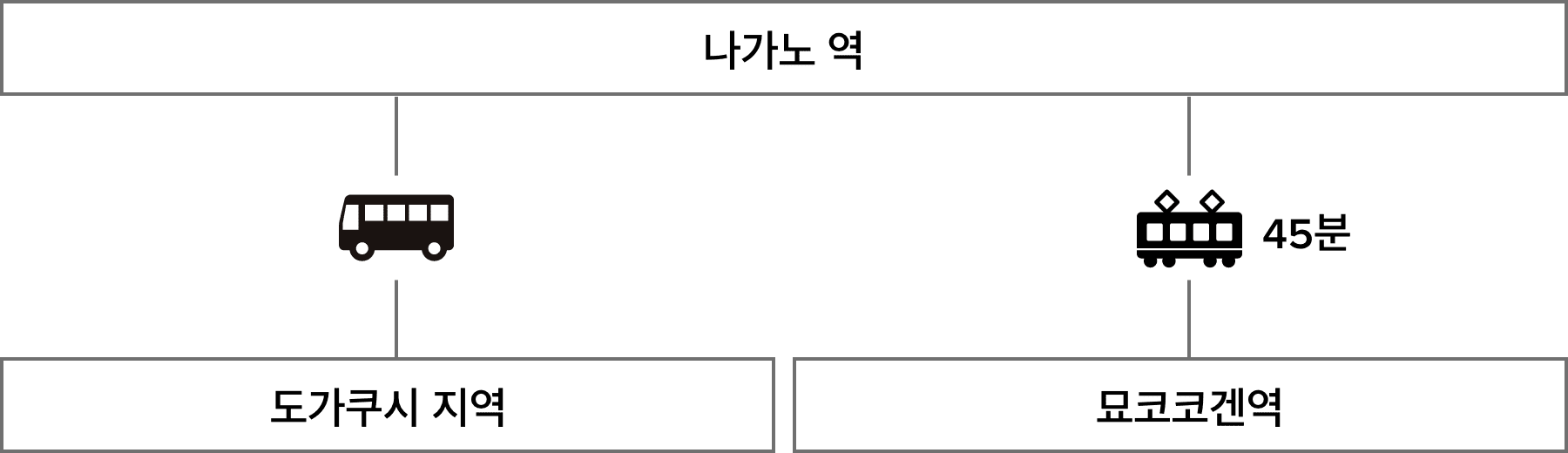 나가노역에서 알피코 버스 회사가 도가쿠시 신사, 어린이 닌자마을, 도가쿠레 닌자 자료관 등의 도가쿠시 지역의 인기 명소로 쉽게 갈 수 있는 버스를 운행하고 있습니다.