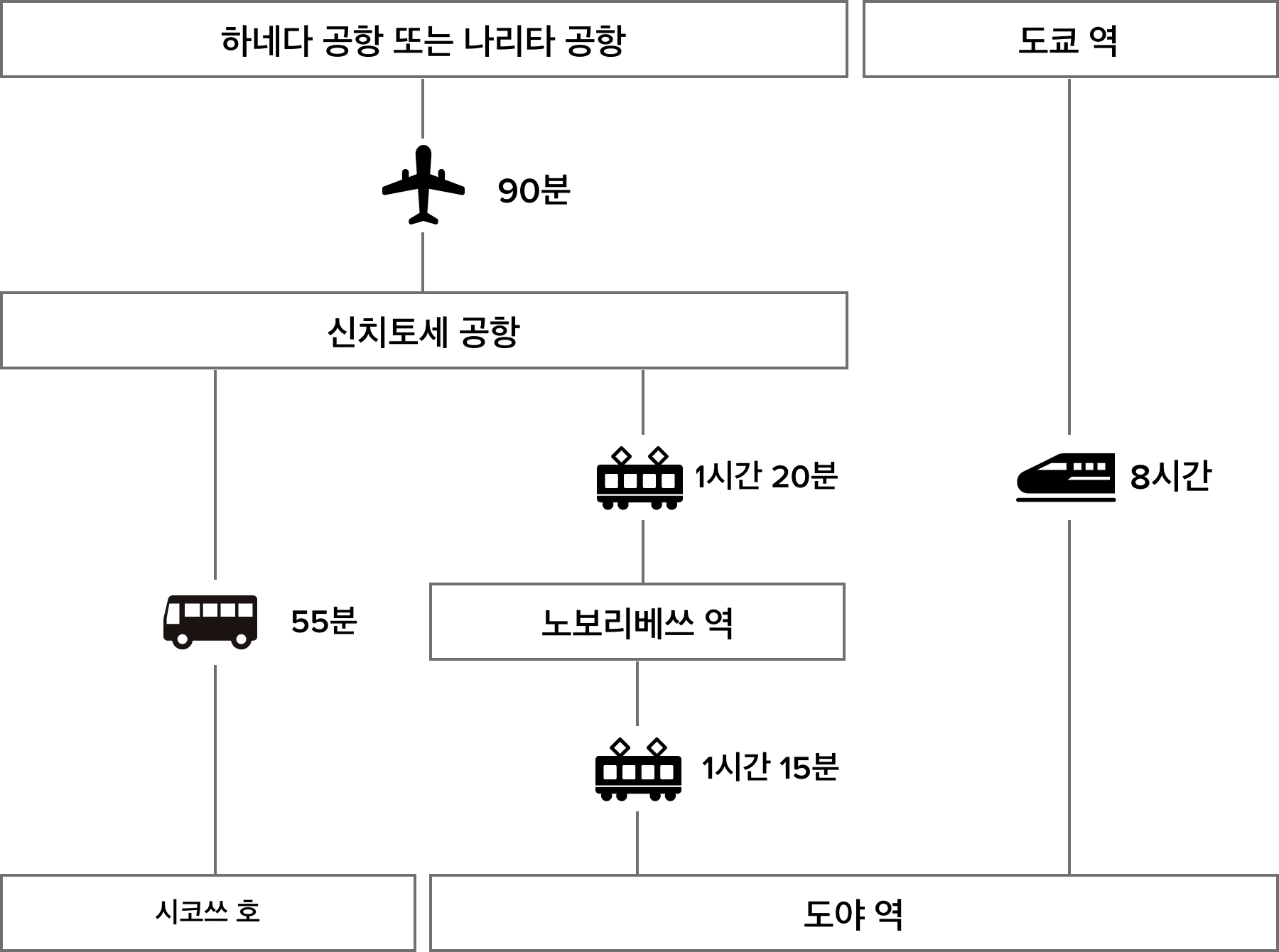 JR 패스가 있는 경우 시코쓰토야 국립공원 안의 여러 지역까지 열차 노선을 이용할 수는 있으나, 약 8시간 가량이 소요되므로 유의해야 합니다. 신칸센은 도쿄에서 하코다테까지 쭉 이어지며, 계속 여행하려면 특급열차로 환승해야 합니다. 더 빠른 선택지는 하네다 공항이나 나리타 공항에서 삿포로 인근 신치토세 공항까지 90분이면 도착하는 항공편을 타는 것입니다. 운항 횟수도 여유롭습니다. 공항에서 시코쓰호 버스 터미널로 가는 홋카이도 츄오 버스(55분)를 타면 시코쓰호까지 이동할 수 있습니다. 노보리베쓰로 가려면 JR 치토세선(공항 급행)을 타고 미나미치토세역(3분)까지 이동한 다음, JR 치토세선/무로란 본선을 타면 노보리베쓰역에 도착(1시간 20분)합니다. 이어 노보리베쓰역에서 도야호로 가기 위해서는 무로란 본선을 타고 도야역(1시간 15분)으로 가거나 JR 수퍼 호쿠토(40분)를 이용하면 됩니다.