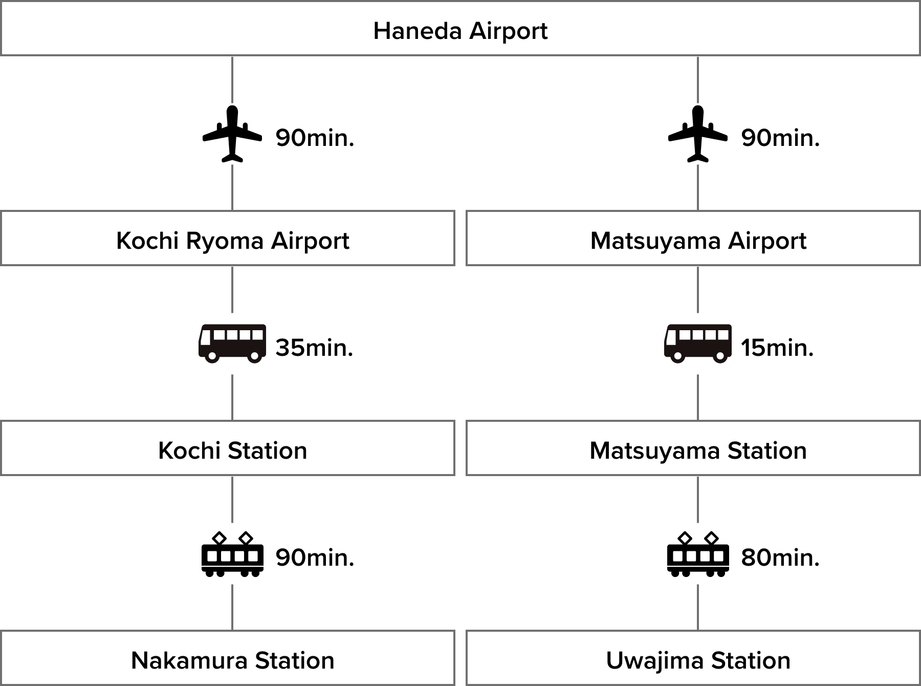 The fastest way to get to the park is to take a flight from Haneda Airport to either Kochi Ryoma Airport or Matsuyama Airport. For the quickest access to the Ashizuri area, fly to Kochi Ryoma Airport (90 min), take the airport shuttle to Kochi Station (35 min), transfer to the Ashizuri limited express train and alight at Nakamura Station (90 min), then follow the instructions in the Nakamura section below. Uwajima Station in the city of Uwajima is the closest train station to the Uwakai area and other inland attractions, but renting a car is the best option to explore the park from here. To reach Uwajima Station, fly to Matsuyama Airport (90 min), take the airport shuttle to Matsuyama Station (15 min), then ride the Uwakai limited express train to Uwajima Station (80 min).
