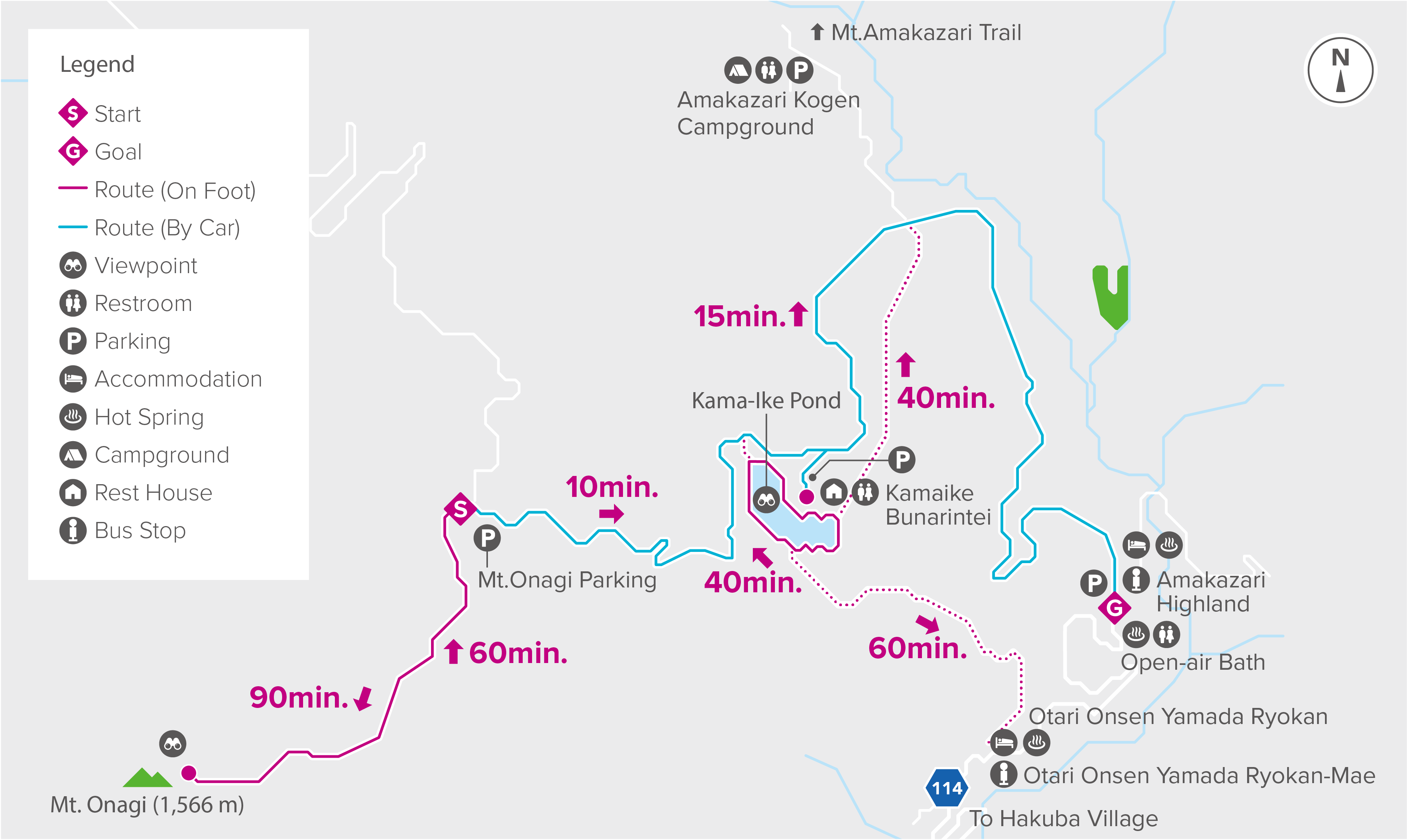 Hike to the summit of Mount Onagi for beautiful panoramic views, before exploring the beech forests surrounding Kamaike Pond. Afterward, enjoy local delicacies at Kamaike Bunarintei rest house and unwind at a natural open-air hot spring in Amakazari Highland. Alternatively, hike to the rustic Yamada Ryokan in the hot spring village, Otari Onsen. (Note: All paths except the passage to Yamada Ryokan are closed in winter.)