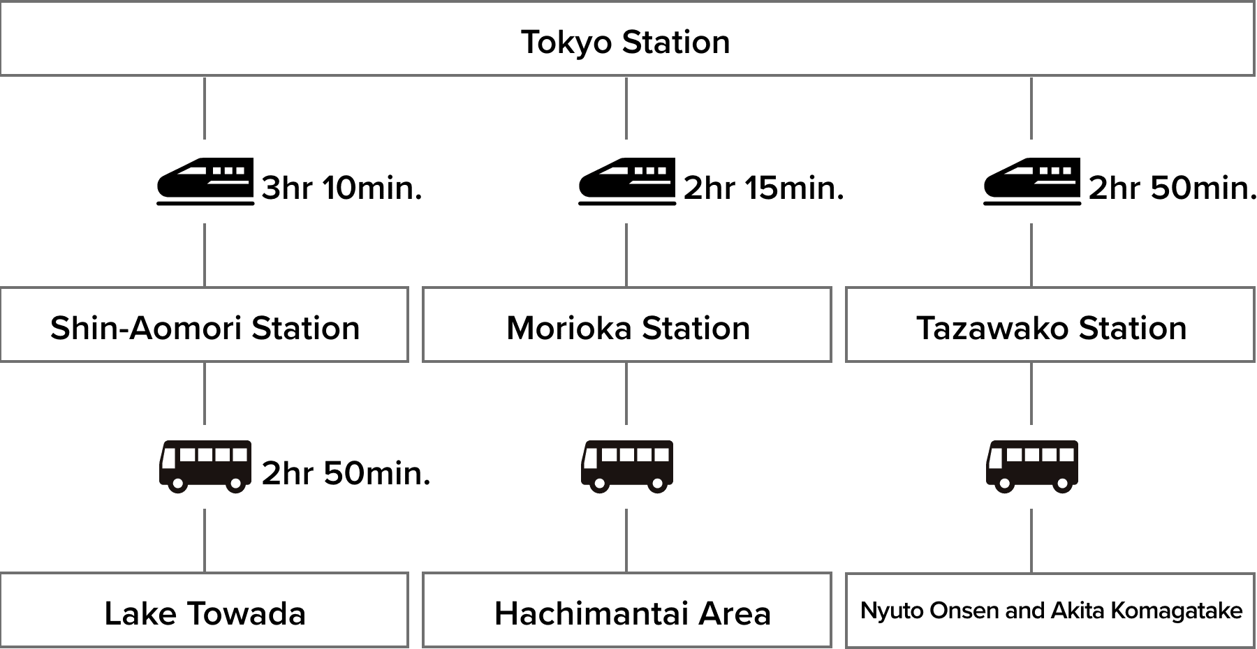 The Tohoku Shinkansen is the quickest way to get to Lake Towada and the Hakkoda Mountains, arriving at Shin-Aomori Station in 3 hours 10 minutes. After that, hop onto a JR bus (seasonal) bound for Lake Towada. Prior to terminating at Lake Towada (2 hr 50 min), the bus stops at the Hakkoda Ropeway (1 hr 15 min), which climbs Mount Tamoyachidake in the Hakkoda Mountains. Note that from mid-November to early April, this service operates between Shin-Aomori Station and Sukayu Onsen, a hot spring at the western foot of the Hakkoda Mountains. To reach the Hachimantai area, meanwhile, take the Tohoku Shinkansen to Morioka Station. Seasonally operated buses take visitors to the summit of Hachimantai. From Tazawako Station, which can be accessed via the Akita Shinkansen, there are buses to Nyuto Onsen and Akita Komagatake.