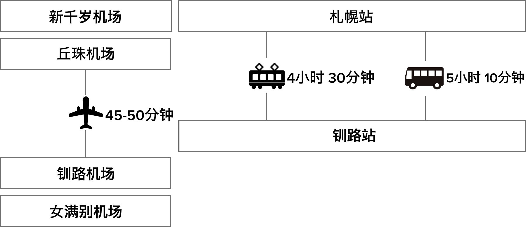 札幌新千岁、丘珠机场与钏路、女满别机场之间有航班频繁往返,全程大约需要 45 到 50 分钟。搭乘“超级大空号”快车从札幌到钏路大约需要 4 小时 30 分钟。钏路与阿寒湖之间有巴士往返,您也可以搭乘 JR 钏网线从钏路前往川汤温泉。阿寒巴士和钏路巴士两家公司每天也有巴士定时往返于札幌与钏路之间。