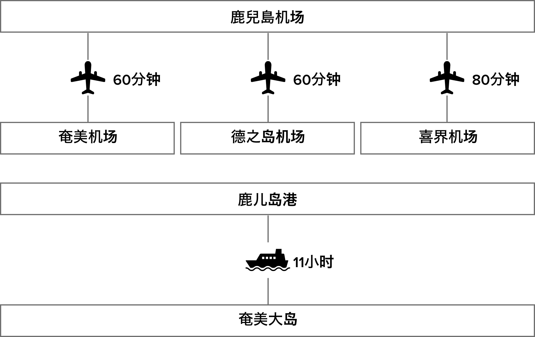 鹿儿岛机场每天有多个航班飞往奄美群岛中多座岛屿上的机场,包括奄美大岛的奄美机场(约 60 分钟)、德之岛的德之岛机场(约 60 分钟)以及喜界岛的喜界机场(约 80 分钟)。两家渡轮公司 Marix Line 和 A-Line Ferry 经营的渡轮以鹿儿岛为起点、冲绳那霸为终点,连接奄美群岛的各座岛屿。其在奄美群岛国立公园的停靠点包括奄美大岛上的名濑港、德之岛上的龟德港、冲永良部岛上的和泊港以及与论岛上的与论港。从鹿儿岛前往奄美大岛大约需要 11 个小时。