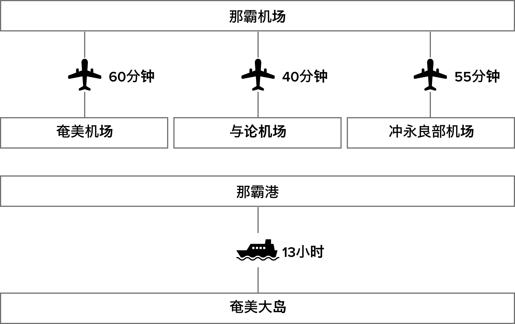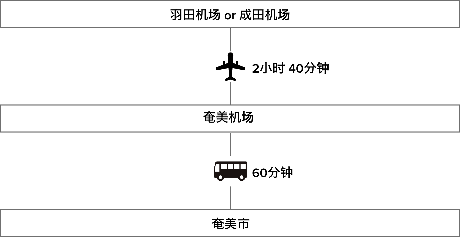 羽田机场和成田机场均有航班飞往奄美大岛(奄美群岛中面积最大的岛屿)上的奄美机场,全程约 2 小时 40 分钟。抵达机场后,您可在附近的租车公司租车。如果您更喜欢公共交通工具,Shima Bus 提供的巴士服务可往返于奄美市(旧称名濑市)中心和机场之间,也通往岛上的其他区域。从机场出发,驾车前往奄美市需要 45 分钟,搭乘巴士则需要 60 分钟。