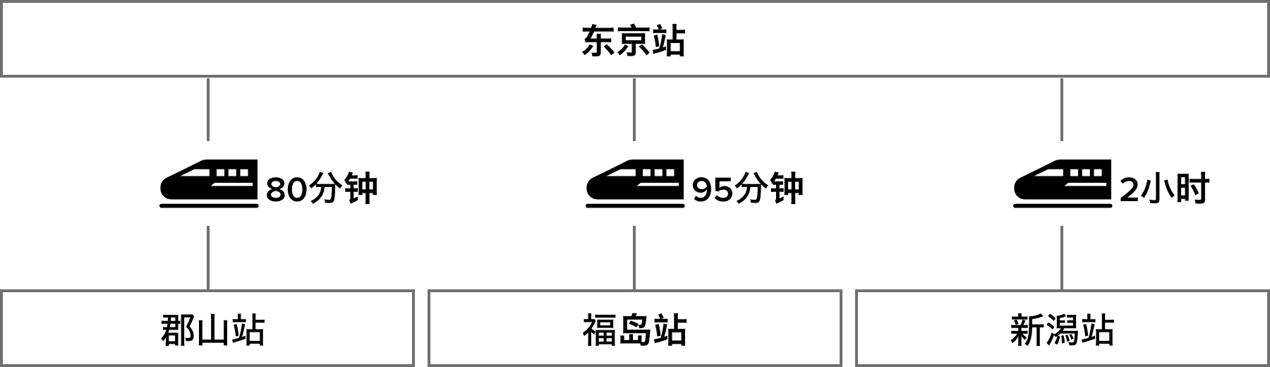 交通时间和方式取决于您想要游览公园的哪些地方。可以先确定游览起点,然后找到距离最近的新干线站点。从东京出发前往磐梯吾妻(猪苗代)地区,可乘坐东北新干线到郡山站(约 80 分钟);要前往饭丰地区,可搭乘东北新干线到福岛站(约 95 分钟)。从东京乘坐上越新干线不到 2 小时即可抵达新潟站,从这里可以前往出羽三山和朝日地区。