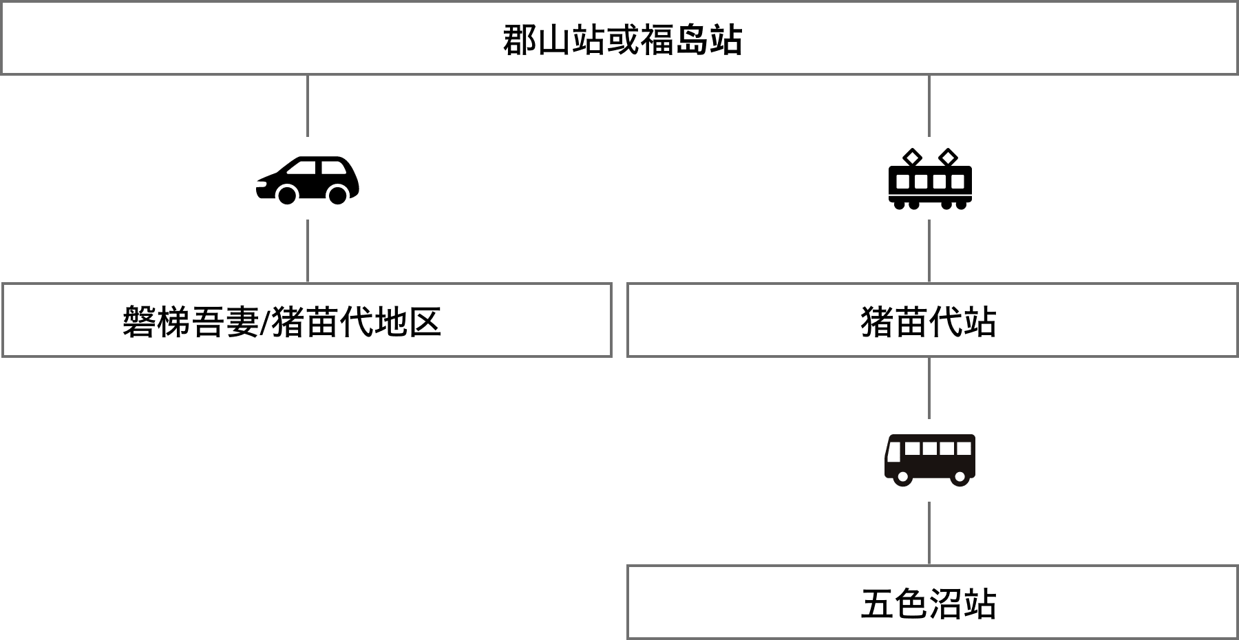 夏季从山都站出发,搭乘磐越西线 45 分钟即可抵达川入登山口。从野泽站或德泽站出发,搭乘磐越西线约 1 小时可抵达弥平四郎登山口(需预约);从越后下关站搭乘米坂线,约 1 小时可抵达饭丰山庄(淡季则为梅花皮庄)。