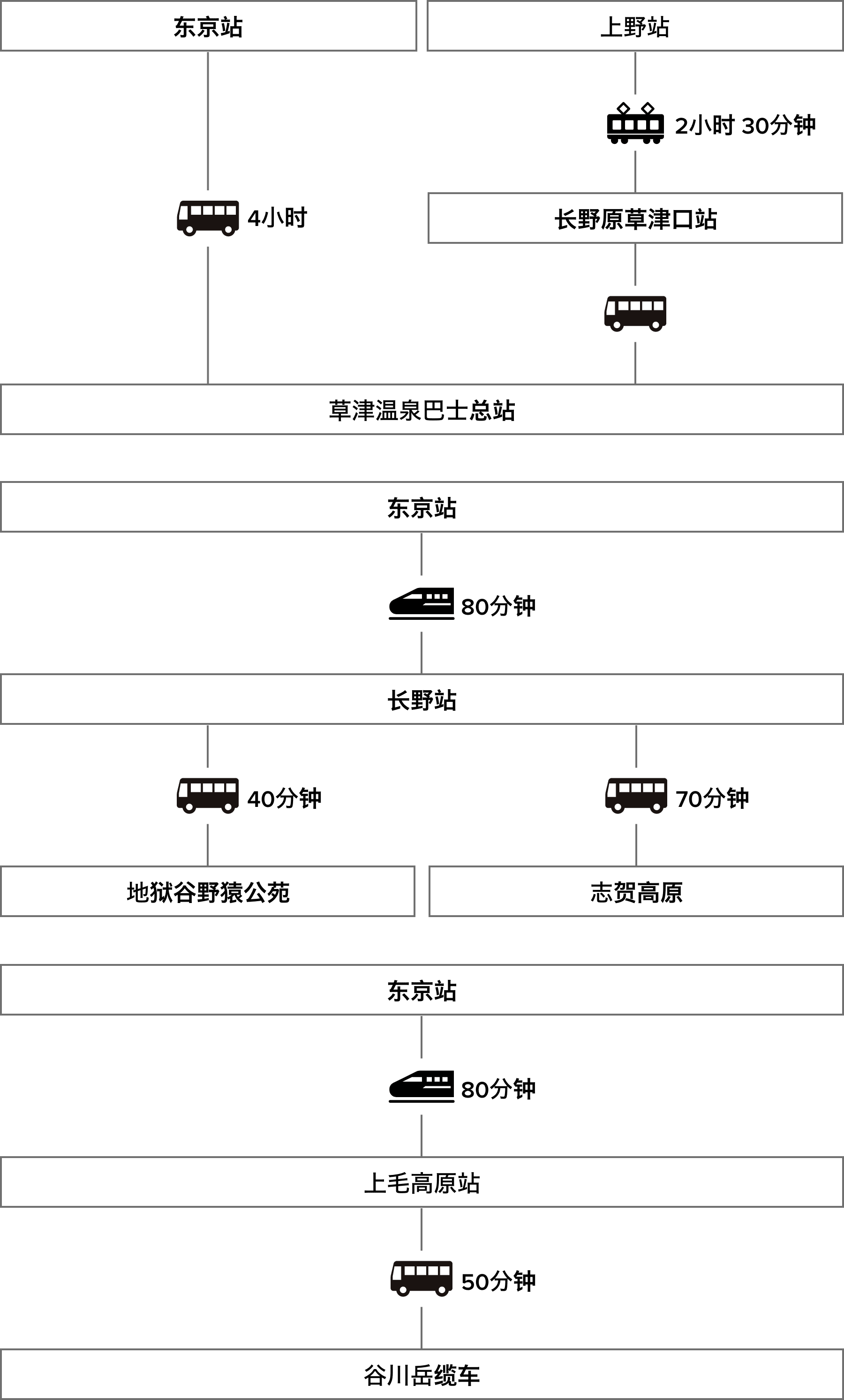 可搭乘定时发车的高速巴士从东京出发,直达小镇中心的草津温泉巴士总站,车程约为 4 小时。也可以从上野站搭乘特快列车至长野原草津口站(约 2 小时 30 分钟),再换乘 JR 巴士前往草津温泉巴士总站(草津町没有火车站)。东京也有开往四万温泉的高速巴士。四万温泉以温泉、公共浴池和传统日式旅馆而闻名。要观赏雪猴(日本猕猴),可从东京搭乘北陆新干线抵达长野站(约 80-100 分钟),再转乘巴士前往地狱谷野猿公苑(约 40 分钟),每天有 10 个班次可供选择。长野站也有许多巴士开往志贺高原(约 70 分钟),或者也可在东京搭乘高速巴士直达志贺高原。如果要前往谷川岳,可搭乘上越新干线抵达上毛高原站(约 80 分钟),再换乘巴士前往谷川岳缆车(约 50 分钟)。