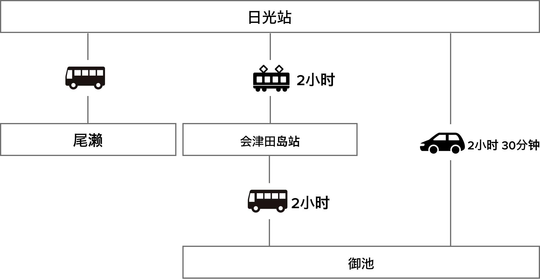如果搭乘公共交通工具前往福岛县的沼山峠登山口,可从日光站搭乘列车至会津田岛站(约 2 小时),再换乘会津巴士至御池(约 2 小时)。如果选择自驾,从日光出发到御池约需 2 小时 30 分钟。从日光市出发,沿 121 号国道至福岛县的南会津町,之后再沿 352 号国道前往御池。
