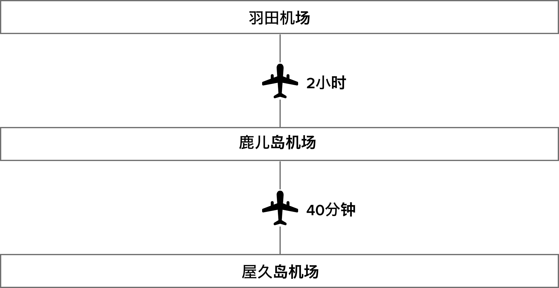 可从羽田机场飞往鹿儿岛机场(约 2 小时),然后转机飞往屋久岛机场(约 40 分钟)。抵达屋久岛机场后,在机场附近的公司租一辆车是最为方便的。如果更喜欢公共交通,可搭乘巴士前往最靠近目的地的车站。岛上有两家巴士公司:种子岛-屋久岛交通和 Matsubanda 交通。