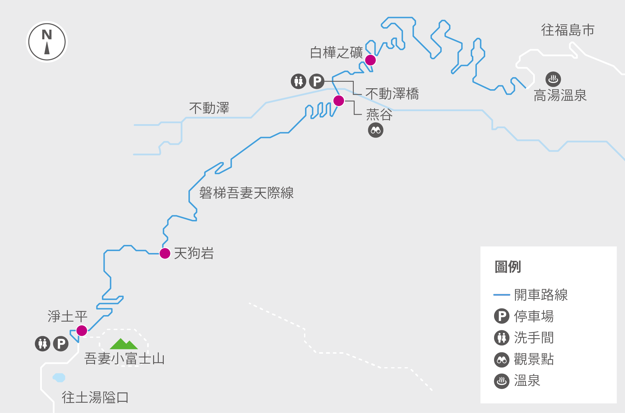 磐梯吾妻天際線沿著吾妻連山的美麗山巒與深谷蜿蜒前行,其駕車觀光路線總長 28.7 公里,所經最高處海拔則為 1,622 公尺。視天氣情況而定,有機會可在此高度享受騰雲駕霧的行車體驗。磐梯吾妻天際線的開放時間為 4 月初至 11 月底,春天可沿雪廊馳騁,夏季有茂盛綠林為伴,秋日則可欣賞繽紛秋葉。