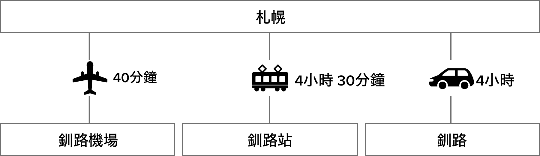 有許多日本國內班機往返於札幌的新千歲機場、丘珠機場以及釧路機場(約 40 分鐘)。若想選擇列車,則可從札幌站搭乘 JR 超級大空號特急列車前往釧路站(約 4 小時 30 分鐘)。若從札幌開車出發,經收費公路前往釧路,車程約為四小時。