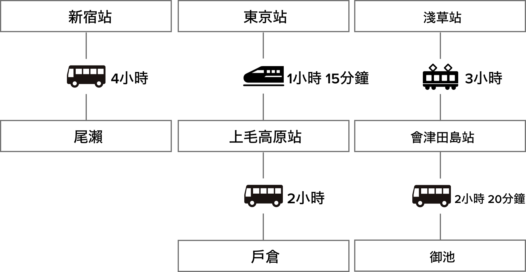 若從東京出發,即會從群馬縣一側進入公園,而關越交通公司提供的巴士服務範圍,涵蓋了園內群馬縣區域的大部分地區。如需取得路線、時刻表和參考行程,請瀏覽該公司的英文版網站。