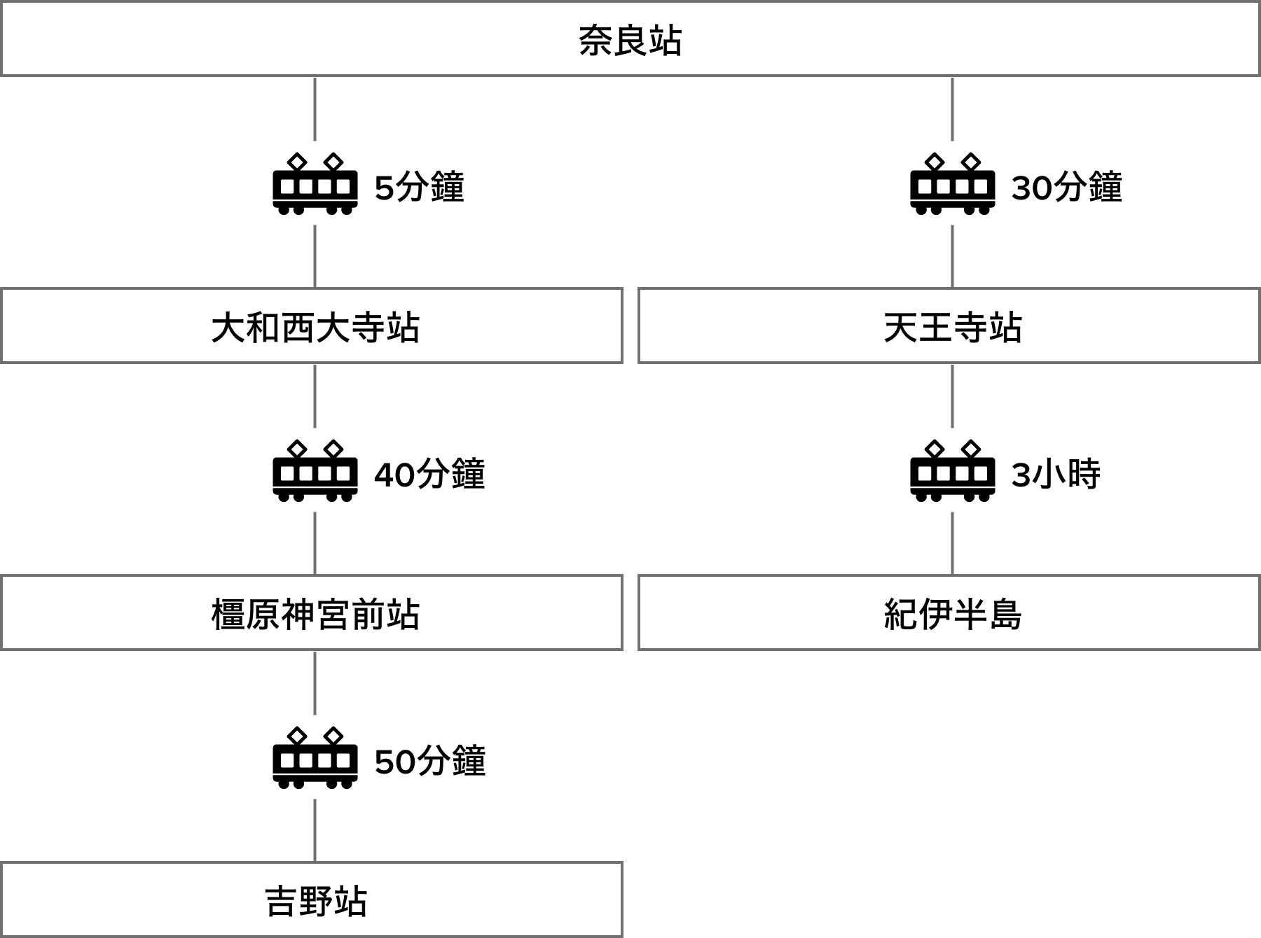 若在奈良住宿,前往吉野山觀光會是很棒的附加行程,櫻花盛開的春季或楓葉繁盛的秋季時節,更是不容錯過。可從奈良站搭乘近鐵急行列車出發,接著在大和西大寺站或橿原神宮前站轉車,最後在吉野站下車(約 1 小時 35 分鐘)。若要前往紀伊半島,可搭乘大和路線至大阪的天王寺站(約 30 分鐘),再轉搭黑潮號特急列車前往旅遊目的地(約 3 小時)。
