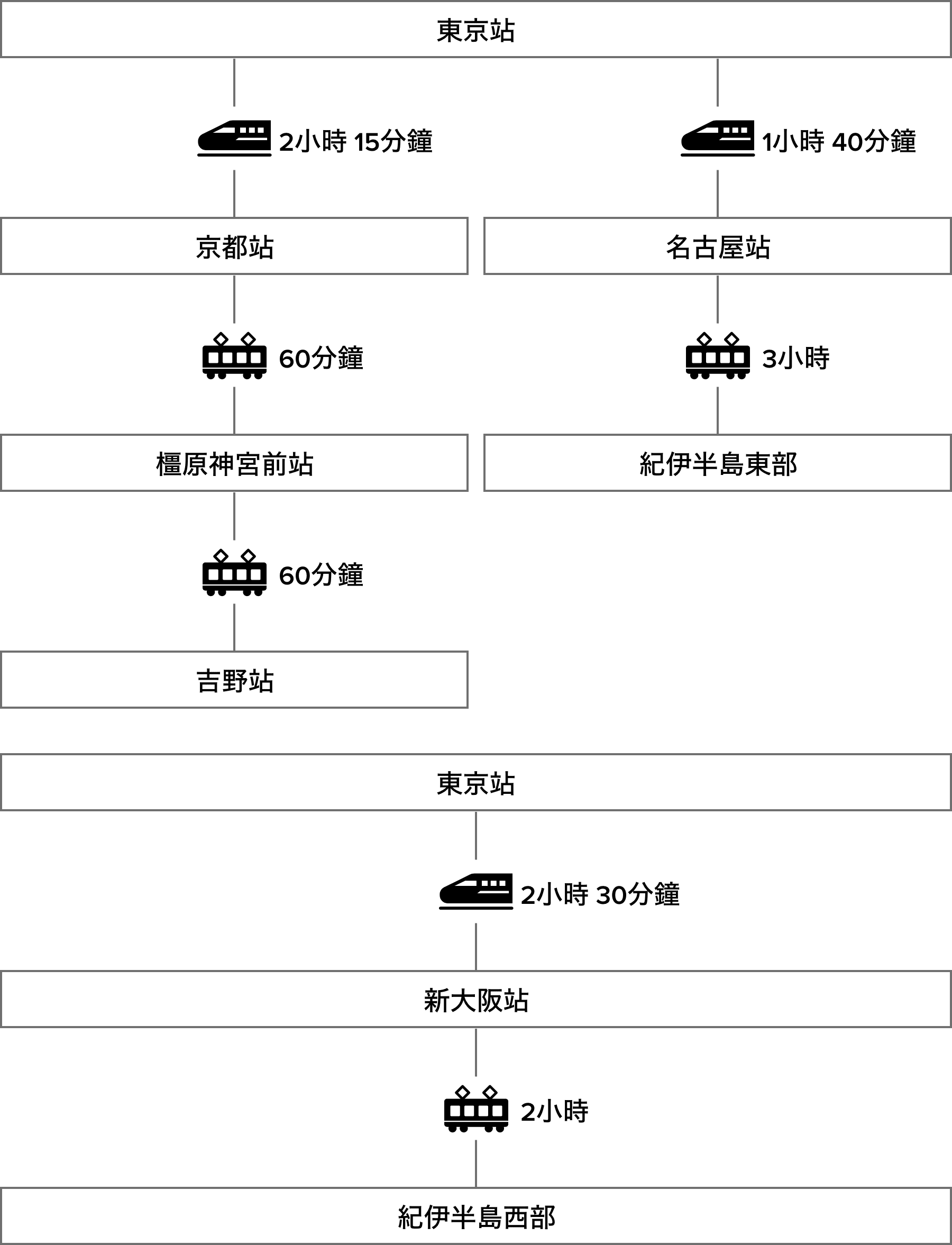 若要前往吉野山,可搭乘東海道新幹線至京都站(約 2 小時 15 分鐘),再轉乘近鐵急行列車或特急列車至橿原神宮前站,接著在該站轉搭另一輛近鐵特急列車至吉野站(約 2 小時)。若要前往紀伊半島東部,從東京出發最快速的交通方式,是抵達名古屋站後轉乘列車。可搭乘東海道新幹線至名古屋站(約 1 小時 40 分鐘),再轉乘 JR 南紀特急列車至紀伊半島,最後在最靠近旅遊目的地的車站下車(約 3 小時)。若要前往紀伊半島西部,最快速的交通方式,是搭乘東海道新幹線至新大阪站(約 2 小時 30 分鐘),再轉乘 JR 特急列車前往紀伊半島,最後在最靠近旅遊目的地的車站下車(約 2~4 小時)。抵達車站後,可搭乘奈良交通、明光巴士、龍神巴士或熊野御坊南海巴士等公司營運的班車(詳見下方的「當地交通」)。